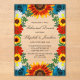 Elegant and colourful floral design for a backyard summer event. Features teal blue roses, white daisies, red wildflowers and sunflowers