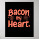 A playful and humourous design featuring the phrase "Bacon My Heart" in bold, colourful letters. The text is surrounded by whimsical bacon-related illustrations, creating a lighthearted and entertaining composition. The overall design is vibrant and energetic.
