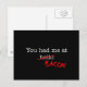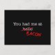 Whether you are a bacon lover or foodie, this baconized design will transport you into a crispy, crunchy, delicious, greasy, bacony state of extreme happiness. Start your own bacon of the month club with these delicious bacon gifts like womens bacon shirts, mens bacon shirts, kids bacon shirts and bacon sweatshirts. Send bacon gifts to everyone who loves bacon. Give a sweet treat to yourself and buy a bacon gift for you every month! Make a bacon t-shirt, bacon necktie, bacon mug, bacon hat, bacon mouse pad, bacon tote bag, bacon keychain, bacon bumper sticker, bacon dog shirt or bacon BBQ apron part of your bacon gift basket. Send a bacon postcard or bacon greeting card to your friend to share your bacon travels. Bacontarians are salty, sassy, and sensuous. Show the world your bacon addiction with a bacon t-shirt, bacon gifts, bacon iPhone case, bacon iPad case, or bacon hoodie. Bacon is man candy, bacon is meat candy, bacon is BBQ. I love bacon. Bacon makes everything better. Buy bacon now! Image description: a black and white design with the words "you had me at hello" with the word "hello" crossed out and the word "bacon" substituted in red.