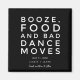 Stylish modern save the date magnets for the fun-loving couple who can't wait to announce their wedding date to their family and friends. Black and white typography design that reads: Booze, food and bad dance moves. Customise with your names and wedding date.
