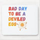 This playful and humorous design features the phrase "BAD DAY TO BE A DEVILED EGG" rendered in a bold, distressed, rainbow-gradient font. Below the text, a delightful cartoon fried egg character with outstretched arms and a wide-eyed, slightly panicked expression perfectly illustrates the pun. It’s a witty graphic, ideal for those who appreciate food-related jokes, clever wordplay, and unique, eye-catching apparel or decor. Perfect for breakfast enthusiasts, culinary humor collectors, or anyone who enjoys a good laugh.