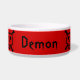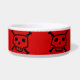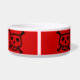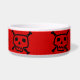 White ceramic dog food / water bowl, done in a Gothic inspired style, with black cartoon like graphics of a skull and crossbones, on a red background. Custom black text is ready to personalise to suit your needs.