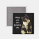 Black and white cat with attitude slogan "What are you looking at" on magnet.