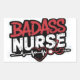 This vibrant and bold sticker features the phrase "BADASS NURSE" in large, eye-catching letters. The word "BADASS" is written in red with a distressed texture, while "NURSE" is in white with a similar texture.