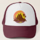 Badge with tropical volcano scenery and palm trees trucker hat