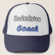 Badminton Coach. Vrolijke pet. Kleuren: blauw, wit en zwart. Leuk om als trotse trainer te dragen.