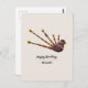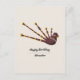 A birthday postcard with bagpipes detailed illustration, adorned with gold and patterns of Celtic knots decorating the bag. Perfect to send to a bagpiper or a lover of Scotland!