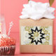 A simple 9-sided star in deep black, on a background of gold and silver coloured floral patterns. This star is a symbol of the Baha'i faith.