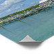 Fluffy clouds float over a marina on Great Abaco Island in the Bahamas. Piers stand in the beautiful turquoise Caribbean Sea waters.