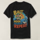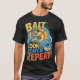 This black t-shirt features a colourful cartoon design of a fisherman reeling in a fish. The words "BAIT," "HOOK," "CATCH," and "REPEAT" are stacked vertically in a playful font, surrounded by waves and a retro-style sunburst. Perfect for fishing enthusiasts.