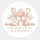 Baker pastry chef product labels, featuring classic baking utensils with a cake on a pedestal stand at the center, including a whisk, rolling pin, piping bag, wooden spoon, and wheat sprigs. The warm copper toned line art and balanced layout create an artisan look that reflects the craft of baking and pastry making. A professional, artisan style choice for bakers, pastry chefs, cake makers, dessert caterers, and home bakery businesses who want a card that reflects handmade baking and attention to detail. Ideal for meeting customers at cake tastings, farmers markets, pop up bakeries, dessert tables, food fairs, and specialty baking events. This version features softly rounded corners for a refined boutique presentation. Prefer a classic square edge? A standard corner version is also available.