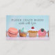 A modern unique French inspired bakery pastry chef or dessert catering business, featuring a row of desserts with frosted and sprinkled cupcakes, macarons, muffin and tart. A whimsical style bakers business card. Pinks, blues, frosting, sprinkles.