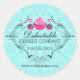 © 2013 Socialite Designs. Our elegant cupcake and cake pops bakery box seals / stickers have an elegant pink cupcake and two cake pops with bows. The aqua background is a subtle damask design. Your business text goes inside an elegant scroll decoration.