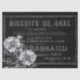 Distressed French text from a 1914 Riviera newspaper advertisement on a black grunge background. Black and white peony floral illustrations. This vintage classified describes the luxury cookies, chocolates and confections available at a local bakery.