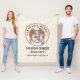 This vintage-style circular logo features a cheerful female pastry chef wearing a traditional white chef's hat and apron. She is framed by a warm orange circular backdrop and holds a wire whisk in one hand and a flaky croissant in the other, symbolising her culinary expertise. Below her, a blank, elegant parchment scroll spans the bottom of the emblem, providing a perfect space for a bakery’s name. The design uses a clean, two-tone colour palette of navy blue and burnt orange with a slightly distressed texture, giving it a professional yet classic artisanal feel.