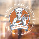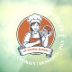 This vintage-style circular logo features a cheerful female pastry chef wearing a traditional white chef's hat and apron. She is framed by a warm orange circular backdrop and holds a wire whisk in one hand and a flaky croissant in the other, symbolizing her culinary expertise. Below her, a blank, elegant parchment scroll spans the bottom of the emblem, providing a perfect space for a bakery’s name. The design uses a clean, two-tone color palette of navy blue and burnt orange with a slightly distressed texture, giving it a professional yet classic artisanal feel.