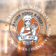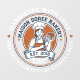 This vintage-style circular logo features a cheerful female pastry chef wearing a traditional white chef's hat and apron. She is framed by a warm orange circular backdrop and holds a wire whisk in one hand and a flaky croissant in the other, symbolizing her culinary expertise. Below her, a blank, elegant parchment scroll spans the bottom of the emblem, providing a perfect space for a bakery’s name. The design uses a clean, two-tone color palette of navy blue and burnt orange with a slightly distressed texture, giving it a professional yet classic artisanal feel.