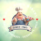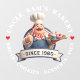 A charming 3D cartoon illustration of a friendly, portly pastry chef with a cheerful smile and a well-groomed moustache. He is dressed in a professional white chef's hat (toque), a vibrant red-and-white striped neckerchief, and blue denim overalls over a white shirt. The chef gives an enthusiastic thumbs-up while balancing a silver tray filled with colourful treats, including frosted cupcakes and glazed doughnuts. The character is framed by a circular backdrop and a large, elegant blank banner at the bottom, designed for custom text or branding. The high-quality CGI style and warm aesthetic make it an ideal mascot for a bakery or confectionery.