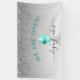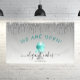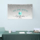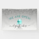 Let customers know your bakery or cake decorating shop is open for business with this elegant banner, featuring a turquoise and silver wedding cake illustration on a silver ombre background, with a top border of silver dripping faux glitter. The words "WE ARE OPEN!" (or text of your choice) arch above the cake in large turquoise sans serif font. Customize the sign with your business name in black handwriting script with swashes at the beginning and end, and your contact information or tag line in black sans serif font. (To keep the swashes, replace only the letters in those text fields, leaving the symbols in place.)