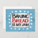 "Baking Bread Is My Jam" is a cute text design in blue with black and red text, along with a white accent shape and white textured whimsical dots surrounding it.