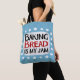 "Baking Bread Is My Jam" is a cute text design in blue with black and red text, along with a white accent shape and white textured whimsical dots surrounding it.