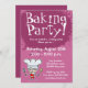 Baking party invitations | Custom invites. Personalizable announcement text and background colour. Have fun! Little chef cartoon with hat, apron, spoon and hand mixer.