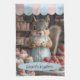 A charming image features an adorable squirrel wearing a striped apron, holding a pink frosted cupcake. The squirrel stands behind a table laden with an assortment of beautifully decorated cupcakes, macarons, and strawberries, set against the backdrop of a quaint bakery with a pink and blue awning. This delightful scene captures the whimsy of a talented squirrel baker in a sweet and inviting setting.
