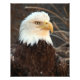 A Bald Eagle's white head feathers are ruffled against the breeze. His gaze is intense as he stares off into the distance.