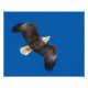 A magnificent bald eagle, photographed as it soars in a vibrant blue sky with eyes cast upward.