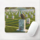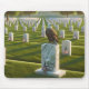 An American eagle perches solemnly atop a tombstone engraved with a cross and an emblem of an eagle