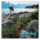 A digital painting of a bald eagle perched on a driftwood log washed up on the rock-strewn coast of Alaska; mountains loom in the distance. Text reading "Alaska" also appears.