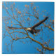 A magnificent bald eagle, photographed as it spreads its wings to fly from a tree limb. The tree limb and eagle stand out against a bright blue sky.