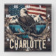 A majestic bald eagle perches on a branch, gazing over the vibrant landscape of Charlotte with mountains and an American flag in the background.