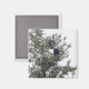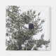 A photograph of an American Bald Eagle in a conifer tree that has many pine cones dangling from it's branches. The mature eagle is perched on a thin limb surveying the landscape. The sky is covered in a light grey cloud, indicating a chilly temperature.