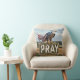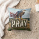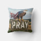 A bald eagle draped in an American flag perches on a rustic wooden sign that reads "PRAY" decorated with green foliage