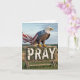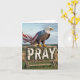 A bald eagle draped in an American flag perches on a rustic wooden sign that reads "PRAY" decorated with green foliage