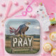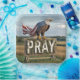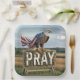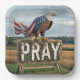 A bald eagle draped in an American flag perches on a rustic wooden sign that reads "PRAY" decorated with green foliage