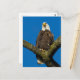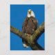 A brilliant bald eagle perched on a branch, backed by a vibrant blue sky