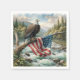 A regal bald eagle on a tree branch overlooking a flowing river with an an American flag