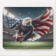 A bald eagle clutching a football is prominently featured, draped in an American flag, soaring over a brightly lit football stadium.