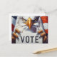 Bald eagle holding a white vote sign with its talons and an American flag is in the background
