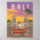 Vintage style travel poster of Bali. Sun goes down, An adventurous girl on a scooter bike with surfboard on it driving along the road in front of Kuta-Legian beach with its traditional Balinese gate. Original illustration by Nasir Udin for Vectro Poster Co.