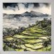 With remarkable attention to detail, every rice terrace is painted with intricate precision, creating a mesmerising tapestry of interlocking shapes and shades. The watercolor medium lends an organic flow to the composition, mirroring the undulating landscape and the gentle sway of the rice plants in the breeze.