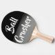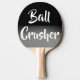 A silver and black ping pong paddle with the text "Ball Crusher". It makes a great gift for the pro ping pong player in the family.