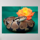 A young ball python peers out of her "ball" with an orange rose and a green background completing the photograph. Perfect for snake lovers!