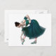 Ballerina in a green romantic style tutu adjusting the ribbons on her pointe shoe, illustration