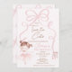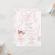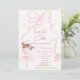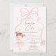 Cute ballerina or tutu themed second birthday invitation featuring a pink bow, cute ballerina in a tutu and ballerina shoes on a faint pink background.