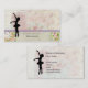 Business card template with a silhouette of a ballerina on a pretty background. This elegant ballet dancer is standing on her toes, en pointe with her arms outstretched gracefully. The background is composed of a shabby vintage looking pattern with flower blossoms. Along the bottom of the card is an old fashioned clock and a floral bouquet.