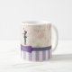 A personalised coffee mug with a silhouette of a ballerina on a pretty background. This elegant ballet dancer is standing on her toes, en pointe with her arms outstretched gracefully.