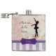 A personalised flask with the words: "Meet me at the barre". Designed with a silhouette of a ballerina on a pretty background. This elegant ballet dancer is standing on her toes, en pointe with her arms outstretched gracefully.